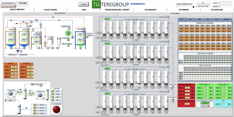 Visualizzazione Grafica: Presenta una rappresentazione grafica del processo (sinottico), mostrando le macchine, le tubature, i serbatoi e altri elementi in modo chiaro. I colori, le animazioni e gli indicatori visivi aiutano a interpretare rapidamente lo stato dell'impianto.
